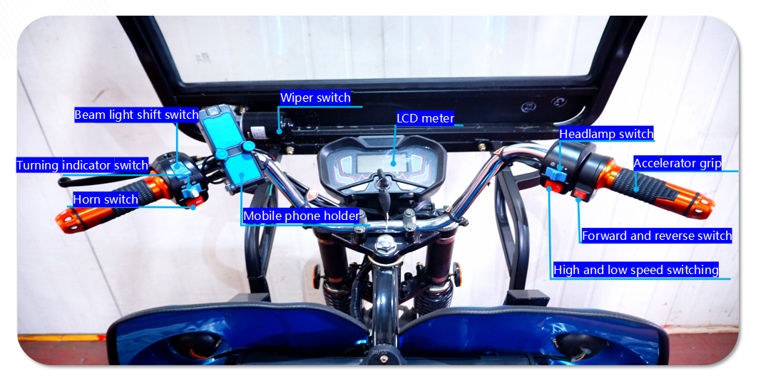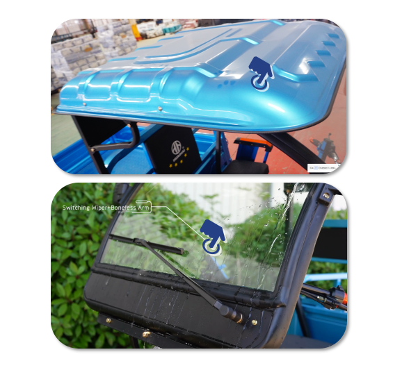 Reinforced one-piece steel roof, protects you from sun burning and rain; Wiper gives you clear vision in raining season. Raining days also can be rewarding and interesting. |
